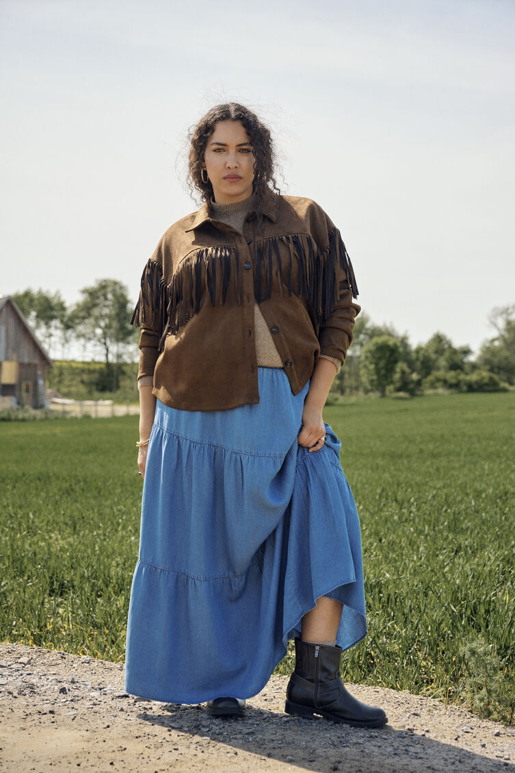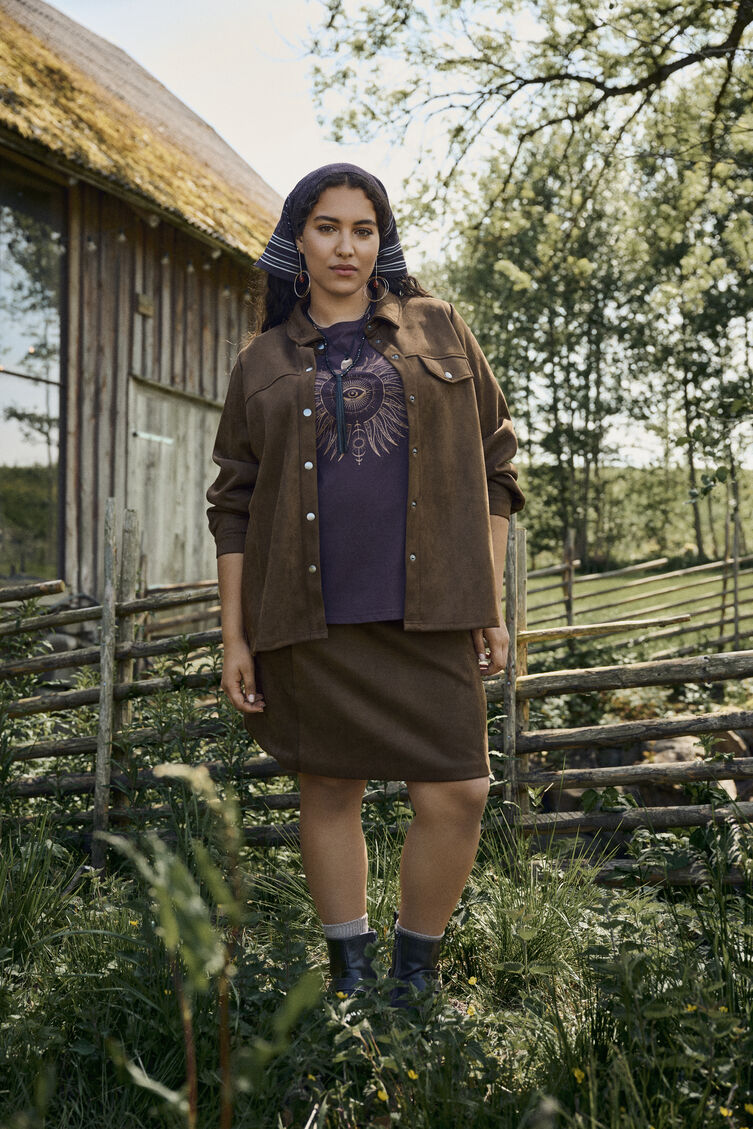 Kurzer Rock aus Wildlederimitat mit einem bequemen, dehnbaren Finish. Der Rock hat eine leicht ausgestellte A-Linien-Form und einen verdeckten Reißverschluss hinten, plus ein weiches Futter.