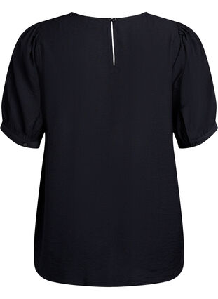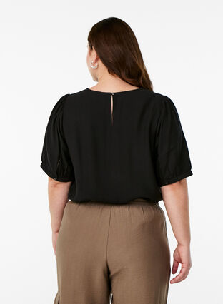 Bluse mit Rundhalsausschnitt und Schlüsselschlitzverschluss auf der Rückseite, halblangen Ärmeln mit schmalen Bündchen, die einen leichten Puffeffekt erzeugen, und einer normalen Passform. Diese Bluse enthält 87 % LENZING™ ECOVERO™ Viskosefasern, die für natürliche Weichheit und einen schönen Fall sorgen.