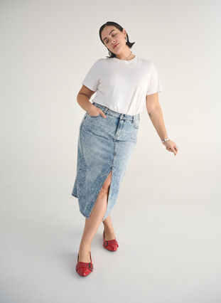 Cooler Maxirock aus weichem Denim mit einem hellen, verwaschenen Finish, das einen zeitlosen Look verleiht. Der Rock hat einen Reißverschluss und Knopfverschluss, Taschen, Gürtelschlaufen und einen vorderen Schlitz, der dir gute Bewegungsfreiheit garantiert.
