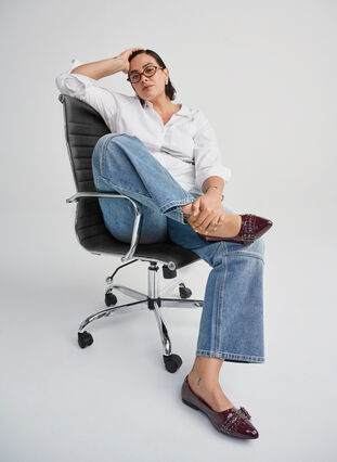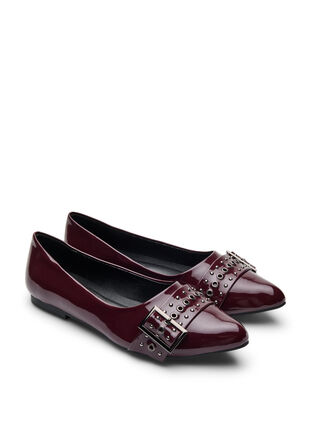 Stylischer Ballerina mit spitzer Zehenkappe und breitem Riemen mit dekorativen Nieten. Der Schuh ist aus Kunstleder mit glänzendem Lackfinish und für breite Füße konzipiert. Die Innensohle hat eine zusätzliche Unterstützung im Fußgewölbe und in der Ferse, die den ganzen Tag über für optimalen Komfort sorgt.