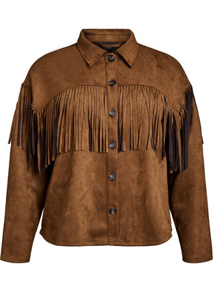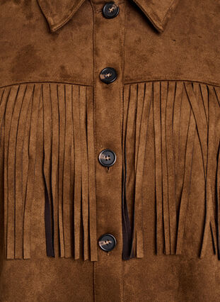 Indoor-Jacke aus weichem Wildlederimitat mit Knopfverschluss und klassischem Kragen. Die Jacke hat lange Ärmel, eine normale Passform und ist mit Fransen auf der Brust und auf dem Rücken gestaltet, die einen coolen Westernlook kreieren.