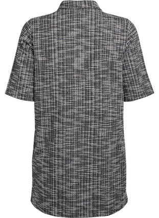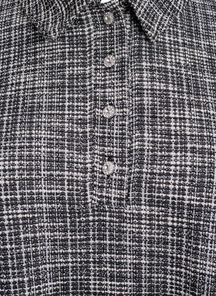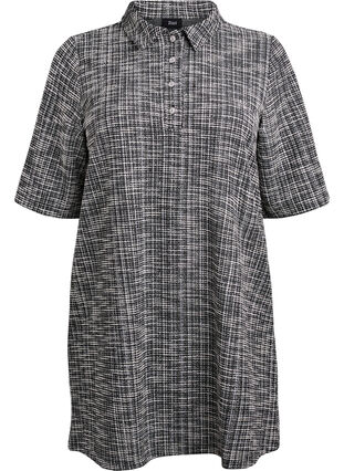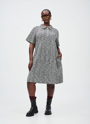 Kurzes Kleid aus einem weichen und dehnbaren Jersey mit grafischem Karomuster und markanter Struktur. Die gewebte Oberfläche hat eine interessante, leicht texturierte Haptik, die dem Stoff Tiefe und Charakter verleiht. Das Kleid hat kurze Ärmel, einen Polokragen und einen halben Knopfverschluss mit vier dekorativen Knöpfen mit dezentem Glitzereffekt. Der Schnitt ist leicht A-förmig und locker, wodurch das Kleid sowohl im Alltag als auch zu schickeren Anlässen bequem ist.