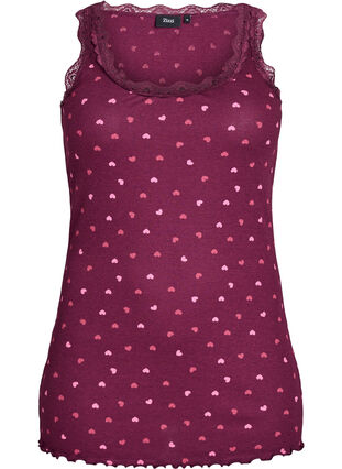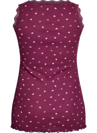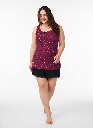 Dieses Oberteil besteht aus einer weichen und bequemen Baumwoll-Modal-Mischung und hat einen schönen Aufdruck. Das Oberteil ist am Ausschnitt und entlang der Träger mit einem eleganten Spitzenbesatz versehen.