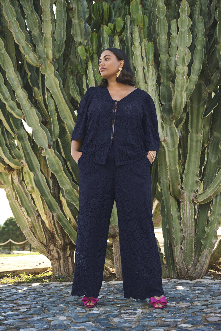 Feminine Spitzenbluse mit schönen geblümten Details in einem leichten und eleganten Design ohne Futter. Die Bluse hat eine normale Passform, lockere Dreiviertelärmel und eine offene Vorderseite mit drei zarten Schleifen als Verschluss.