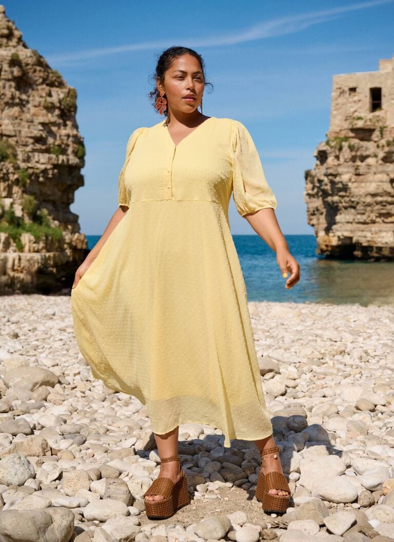 • Wenn du deinen Look aufwerten möchtest, versuche es mit einem Partykleid mit feinen Details im oberen Bereich und einem schlichteren Rock – oder mit einem langen Sommerkleid mit dünnen Trägern und einer klar definierten Taille. Das wirkt leicht und elegant.