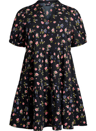 Feminines Kleid aus einem weichen und leichten Material. Das Kleid hat kurze Ärmel mit einem dezenten Puffeffekt, einen V-Ausschnitt und Nahtdetails am Saum, die einen leichten Fall für die lockere A-Linien-Form erzeugen.
